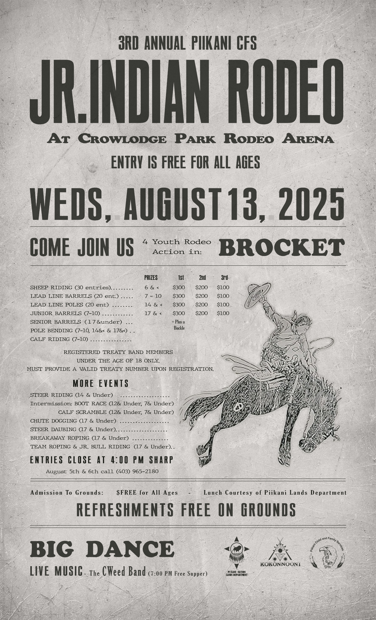 Join us at the 3rd Annual Piikani CFS Junior Indian Rodeo on Wednesday, August 13, 2025, at the Crowlodge Park Rodeo Arena in Brocket! This exciting day of youth rodeo action is free for all spectators and a great opportunity to support our young riders as they compete and grow in skill and confidence. Entries must register by calling 403-965-2180 on August 5 or 6 — registration closes promptly at 4:00 PM.